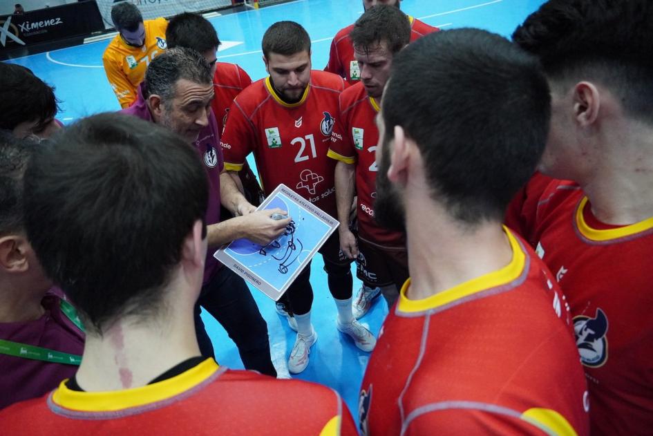 Entrando en el último cuarto del choque, con Álvaro Martínez y Edu Calle como referencia ofensiva, el Recoletas se acercó a un gol en dos ocasiones hasta conseguir incluso empatar de la mano de Miguel Martínez, 25-25, a falta de 9 minutos. Las porterías tomaron protagonismo entonces y el Recoletas obligado a jugar seis contra seis no era tan resolutivo.