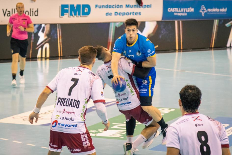 Miguel Martínez y Karapalevski ponían tres arriba a los gladiadores azules, su máxima renta de la primera mitad, 9-6, pero el cuadro riojano levantó su desventaja con un parcial de 1-5 y el pivote Uríos de estilete para ponerse por delante. Pero gracias al acierto del italiano Nico D´Antino en su reaparición, el cuadro pucelano tomó la delantera marchándose a vestuarios con dos de renta, 19-17.
