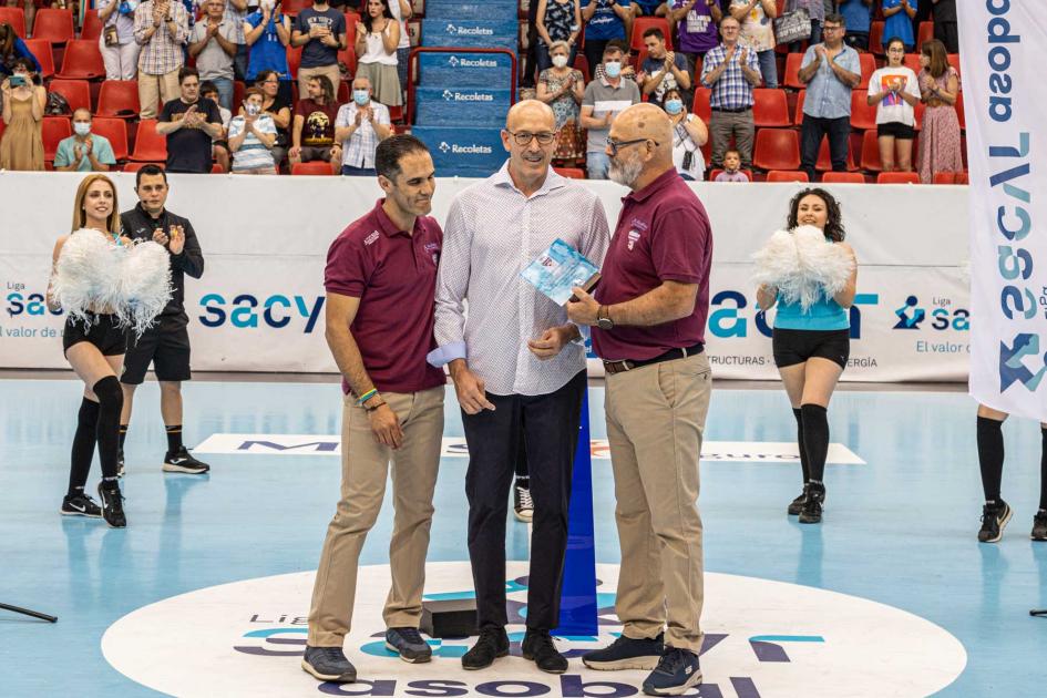 El acto se ha celebrado en los prolegómenos del partido que ha enfrentado a los gladiadores azules contra Incarlopsa Cuenca hoy sábado en Huerta del Rey. Han acompañado a Fernando Bolea en la pista del pabellón vallisoletano el presidente Mario Arranz y el directivo Rafa Mejías, que fue compañero de Bolea en el Michelín, haciéndole entrega de un obsequio conmemorativo por su dilatada trayectoria.