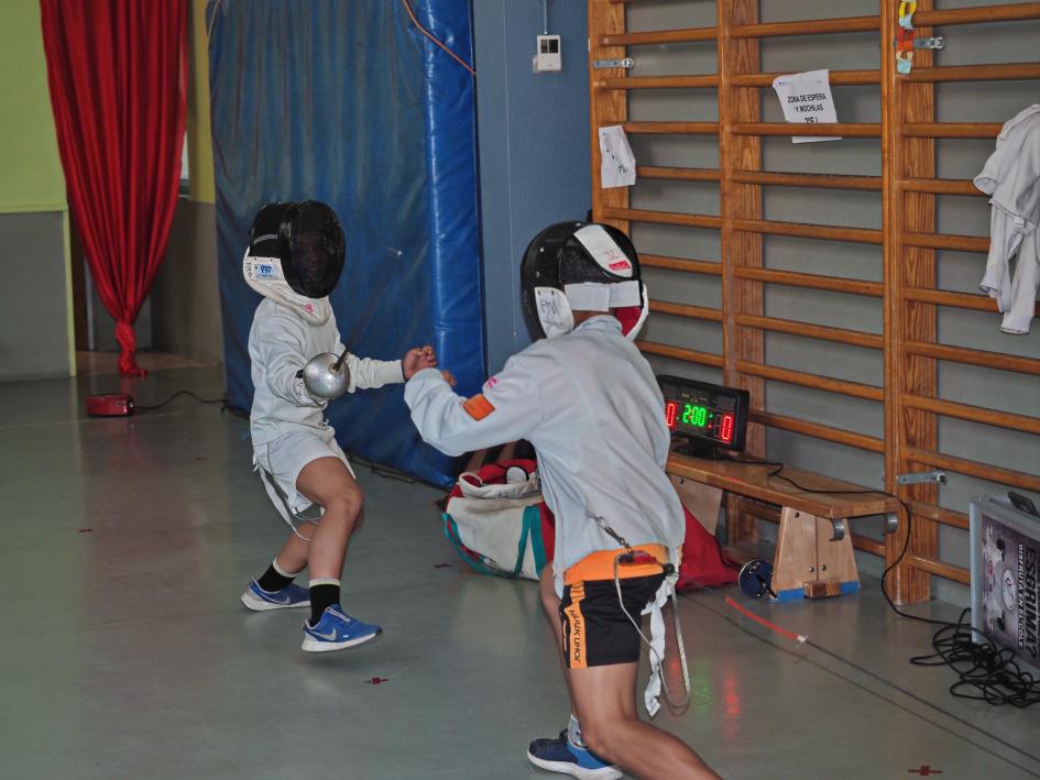 Y para terminar la sesión práctica qué mejor que medir a dos tiradores en un duelo oficial. Para ello fueron ataviados con todo lo necesario, y midieron sus fuerzas a un breve combate a tres tocados, que en ambos casos se resolvió por la vía rápida con algún joven que demostró especial habilidad para este bello deporte.