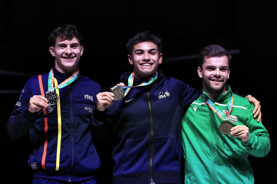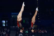 La primera de las preseas la conseguían los cuatro pucelanos, David Franco, Carlos del Ser, Nicolás Toribio y Andrés Martínez en la modalidad de doble minitramp, donde lograban la segunda posición por equipos, únicamente superados por el equipo de Estados Unidos.